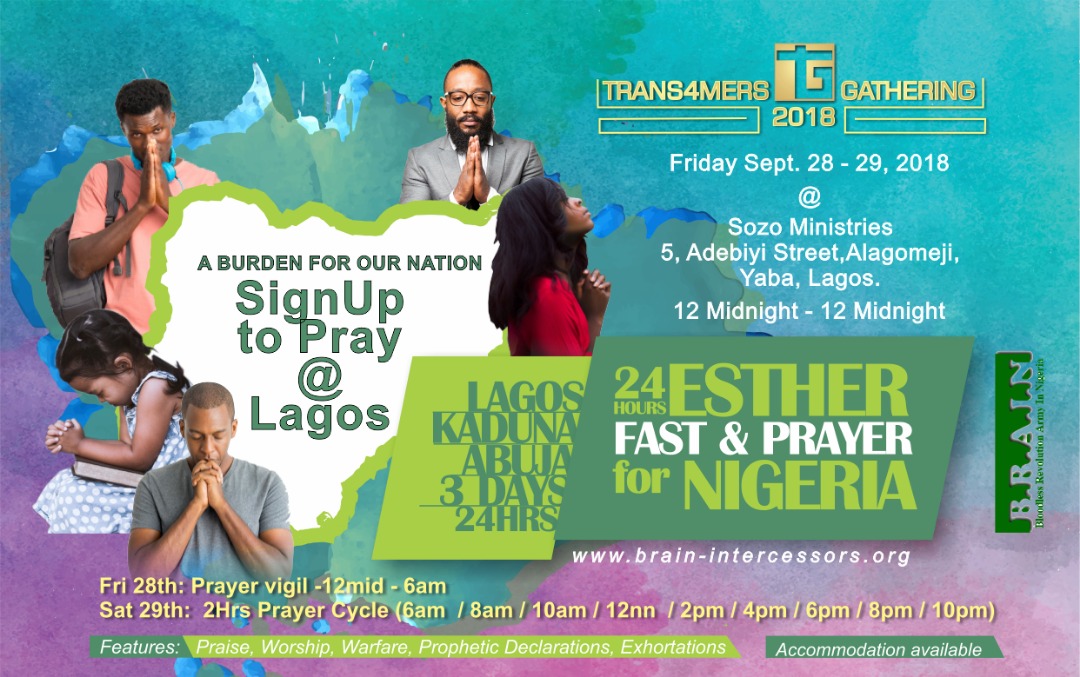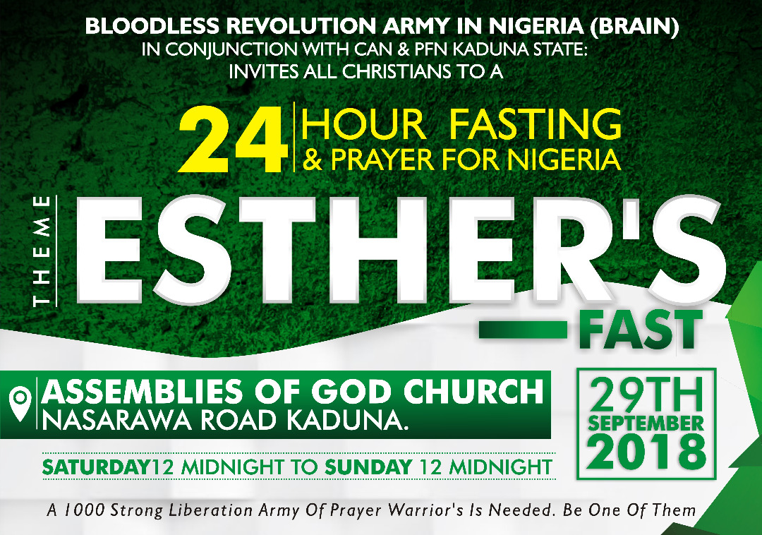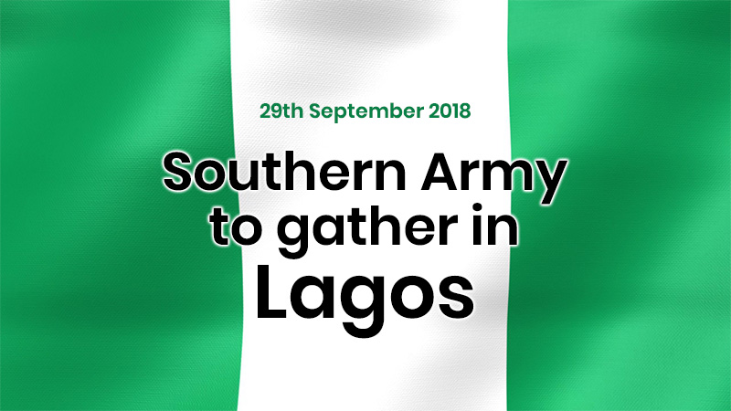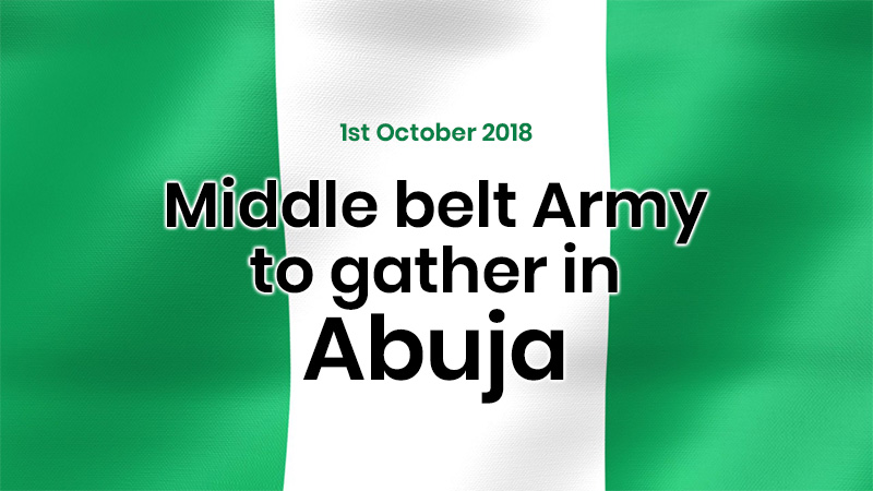 29th September - Southern Army to gather in Lagos for 24hrs chain prayer and fasting30th September - Northern Army to gather in Kaduna for 24hrs chain prayer and fasting1st October - Middle belt Army to gather in Abuja for 24hrs chain prayer and fasting